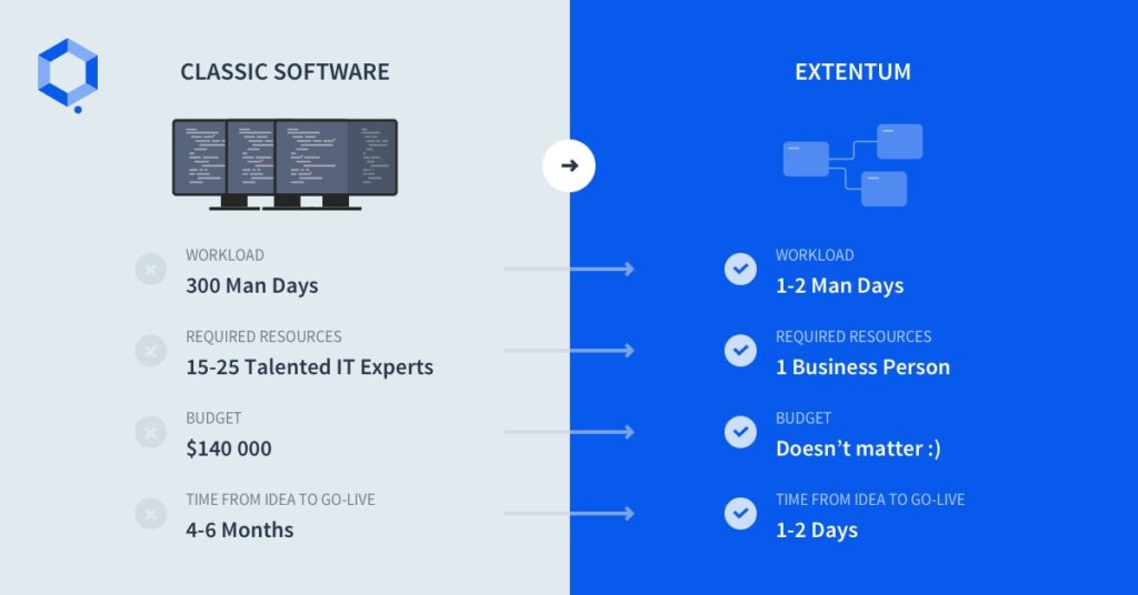 With FINANTEQ’s no-code platform, Extentum, you will quickly (1-2 days) digitize your banking processes. First of all, Extentum is the answer to the problem of writing complicated code.